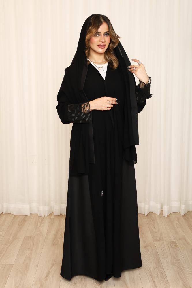 عباية سوداء أنيقة بلمسة دانتيل فاخرة على الأكمام، تجمع بين البساطة والرقي لتمنحك إطلالة كلاسيكية مميزة تناسب جميع المناسبات