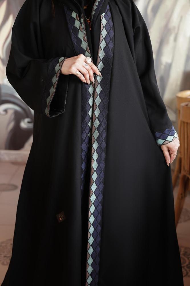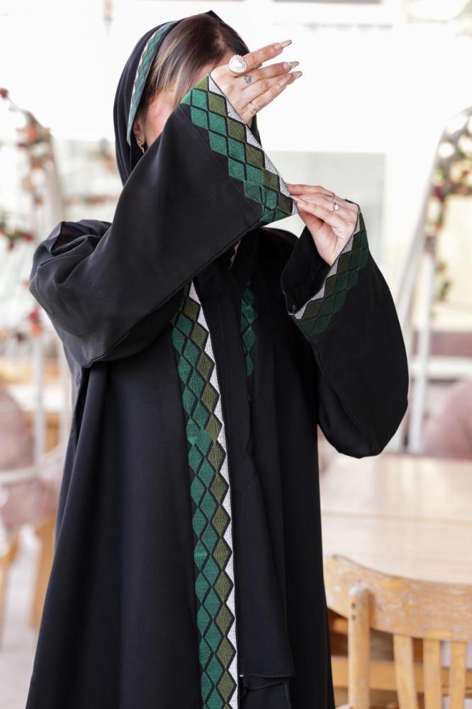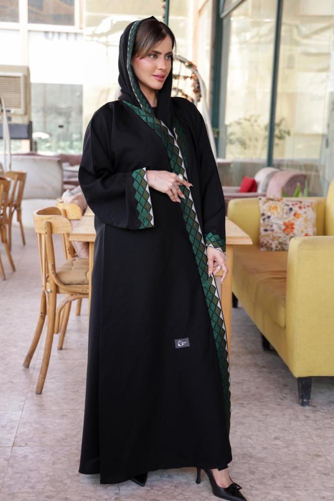 عباية أنيقة بتطريز هندسي عصري يجمع بين الأناقة والتميز. مصنوعة من قماش كريب كتان فاخر، مع تطريز هندسي بلون أخضر وأسود على الأكمام والطرحة، لتمنحك إطلالة شبابية راقية تناسب المناسبات والمشاوير اليومية